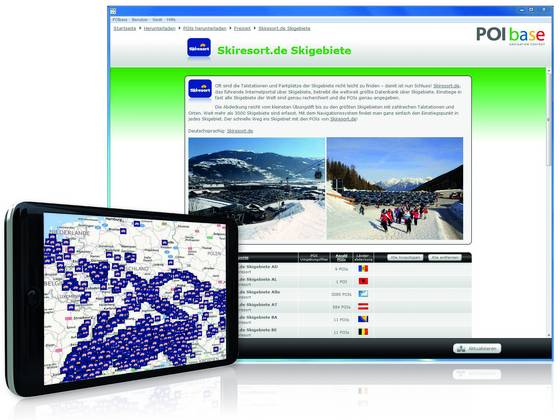 Skiresort.at, das weltweit größte Skiportal, nutzt die Software POIbase um Skifahrern und Snowboardern die gewünschten Skigebiete und viele aktuelle Zusatzinfos jetzt auch auf das Navigationssystem zu übertragen.