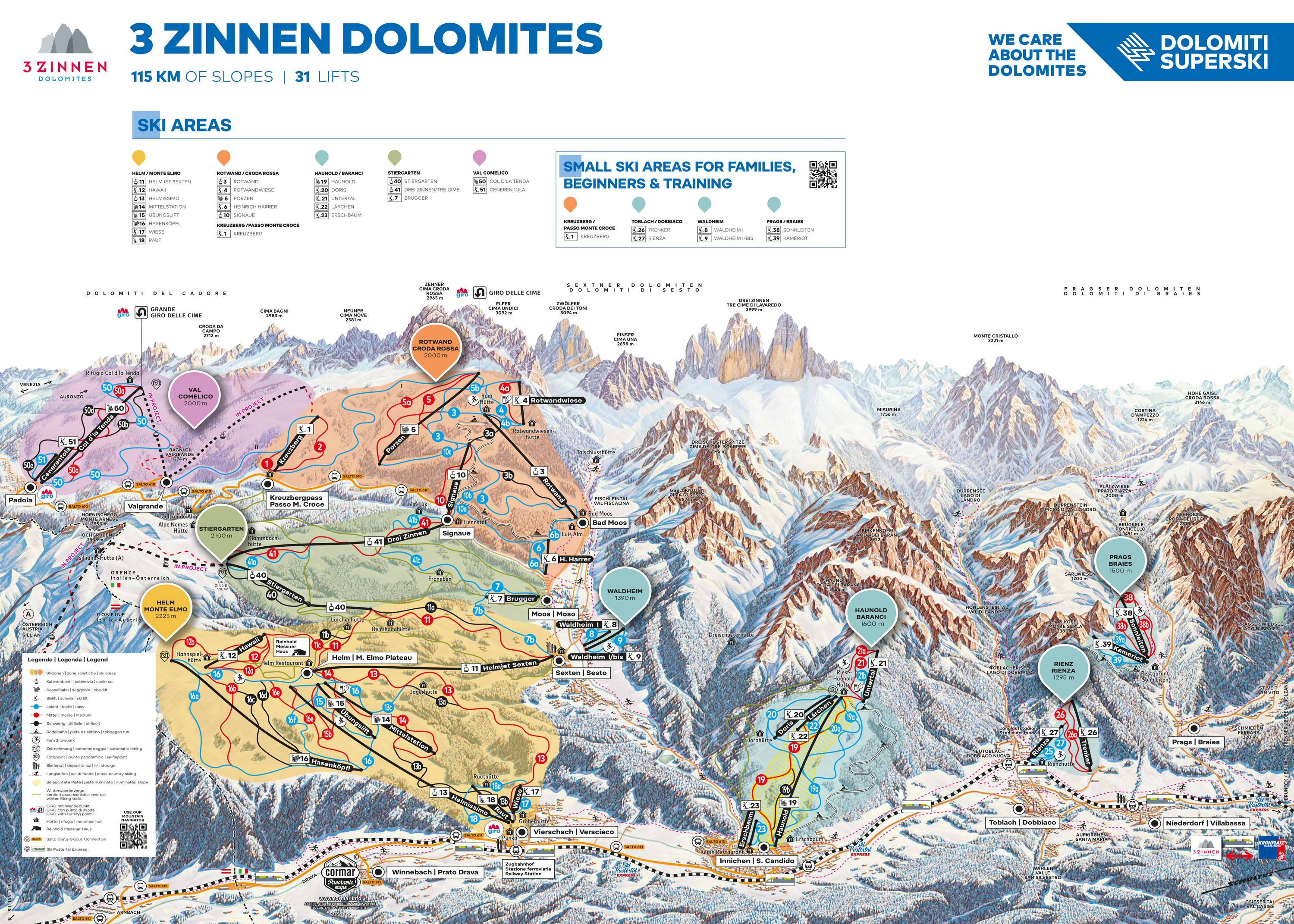 Der Pistenplan zeigt alle Skigebiete der Dolomitenregion Drei Zinnen. Die Lifte und Pisten sind alle beschrieben. Es sind auch weitere Informationen und der komplette Dolomiti Superski Pistenplan mit aufgenommen.