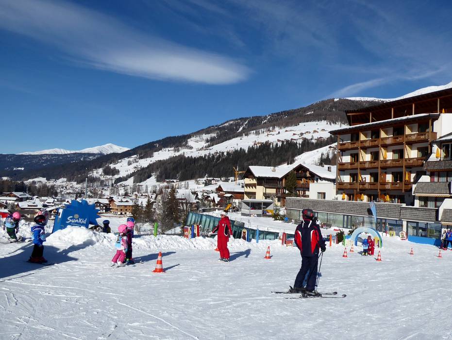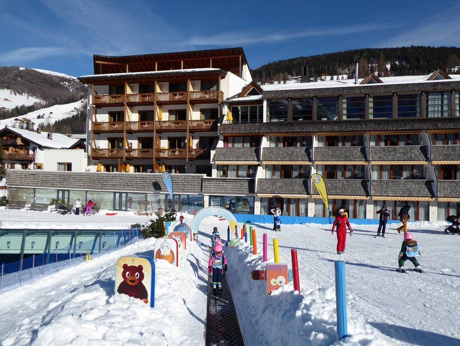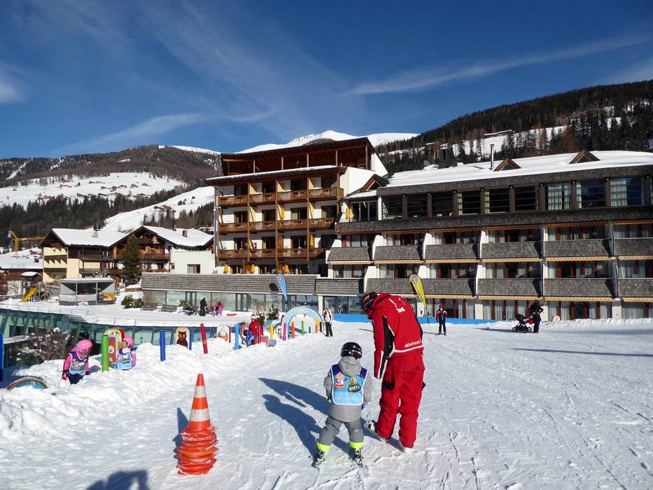 Direkt am Family Resort Rainer in Moos befindet sich ein Kinderland mit Zauberteppich. Die Skischule Sexten betreut das Kinderland liebevoll.