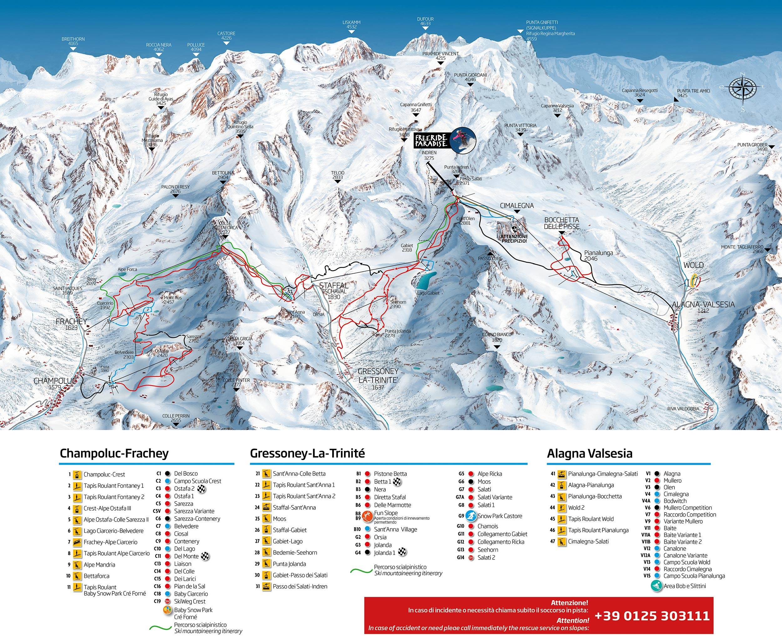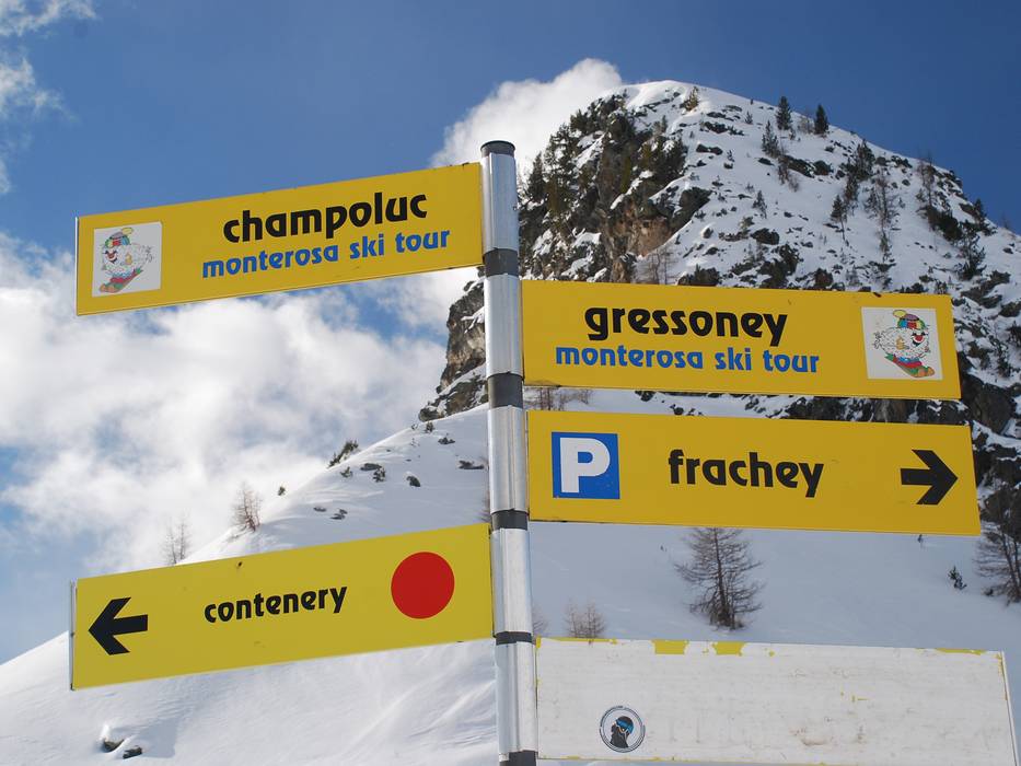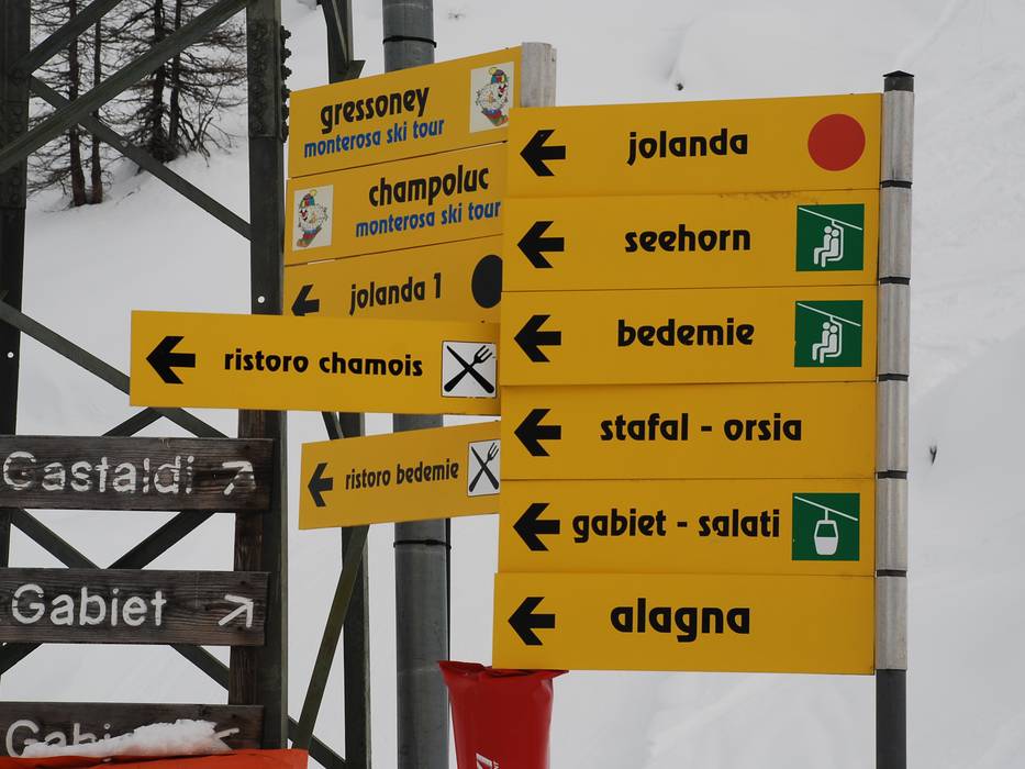 Orientierung (Pistenplan, Informationstafeln, Ausschilderung) und Sicherheit im Skigebiet Alagna Valsesia/Gressoney-La-Trinité/Champoluc/Frachey (Monterosa Ski)