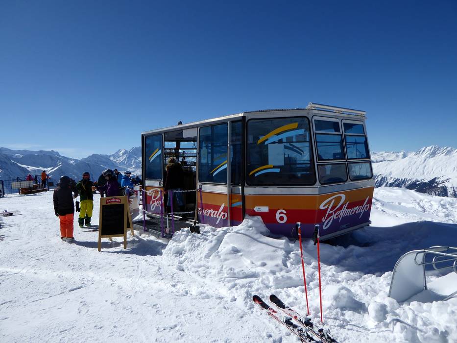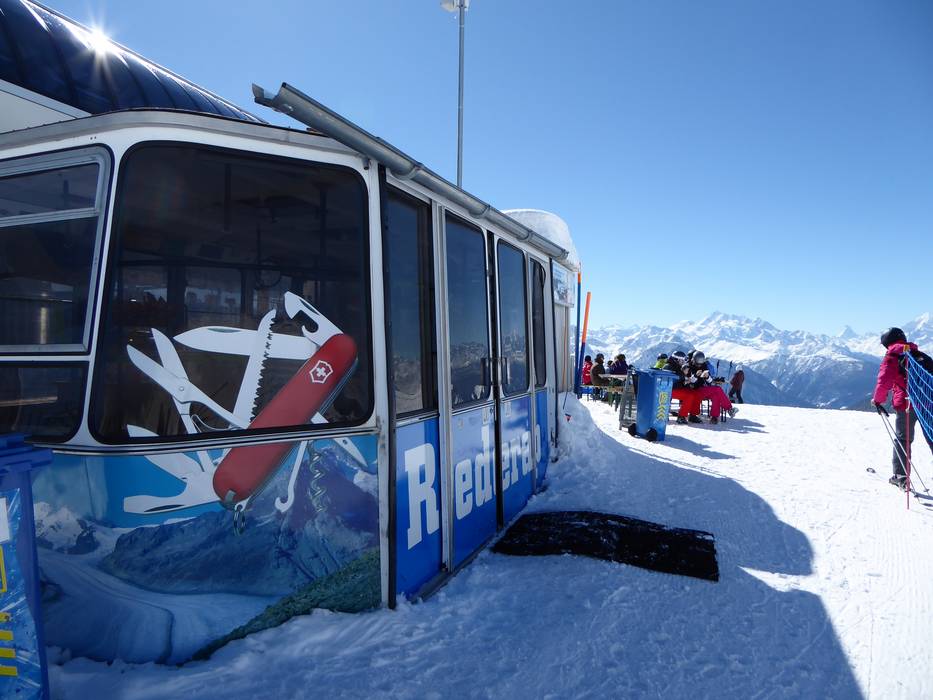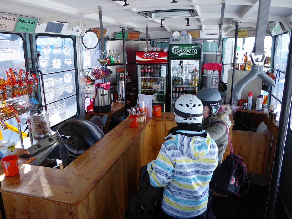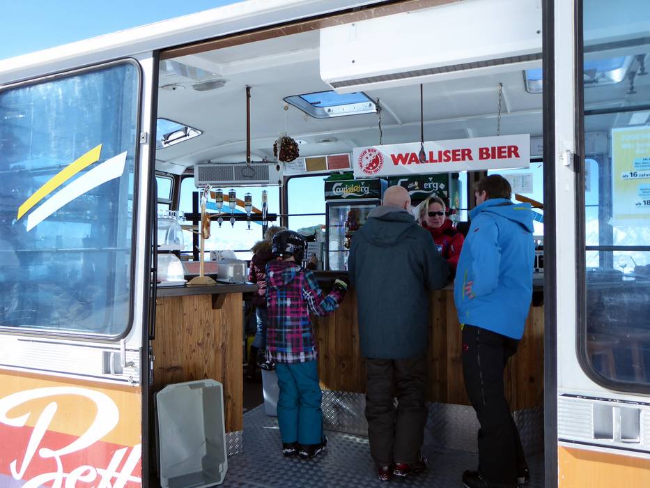 Après-Ski-Bar mit Blick auf den Großen Aletschgletscher. Eine Seilbahnkabine wurde zu einer Bar umgebaut.