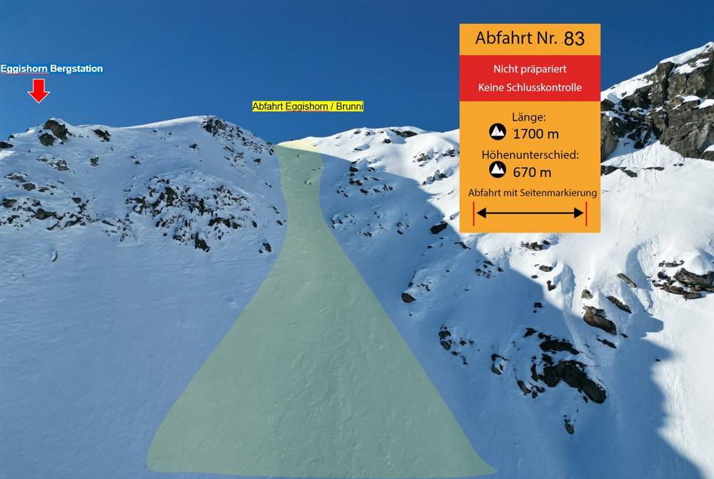 Die «Abfahrt» startet beim View Point Eggishorn, hinter der Horli-Hitta. Die ersten 140 Meter dieser «Abfahrt» sind sehr eng und sehr steil. Die gesamte Strecke ist 1700 Meter lang und überwindet einen Höhenunterschied von 670 Metern. Die «Abfahrt» im Bereich Eggishorn/Brunni endet beim Sessellift Heimatt. Eine «Abfahrt» wird nicht präpariert und es findet keine Schlusskontrolle statt, wird aber vor alpinen Gefahren ggesichert. Die «Abfahrt» ist nur für sehr gute Skifahrer*innen geeignet.2023/2024