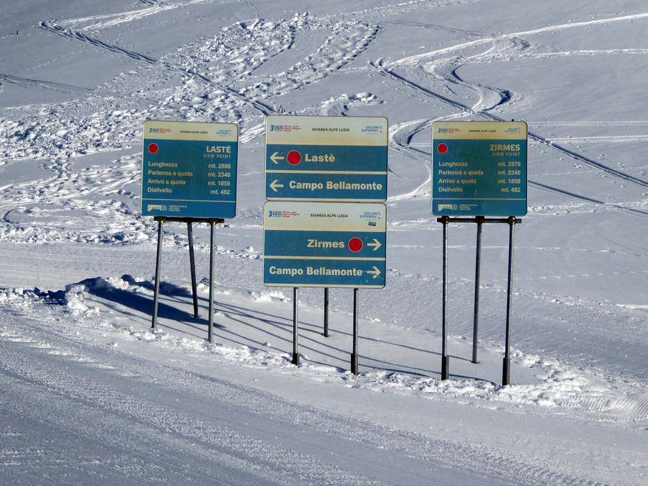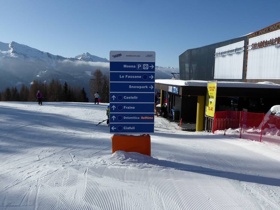 Orientierung (Pistenplan, Informationstafeln, Ausschilderung) und Sicherheit im Skigebiet Alpe Lusia – Moena/Bellamonte