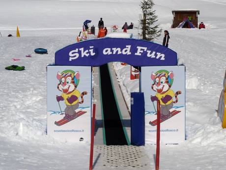 "Ski and Fun" heißt das Motto der Skischule Colfosco. Im Skikinderland finden die Kleinen ein Förderband und viele lustige Figuren vor. Die Skilehrer betreuen oder unterrichten die Kinder.