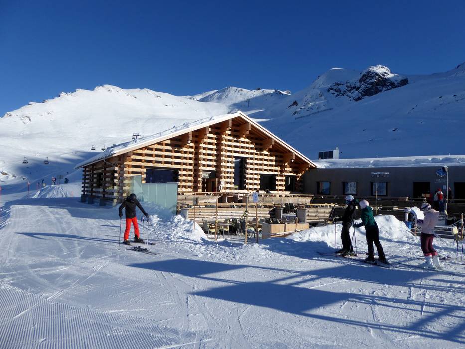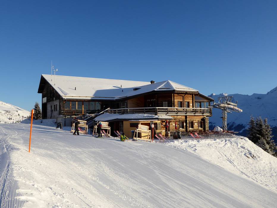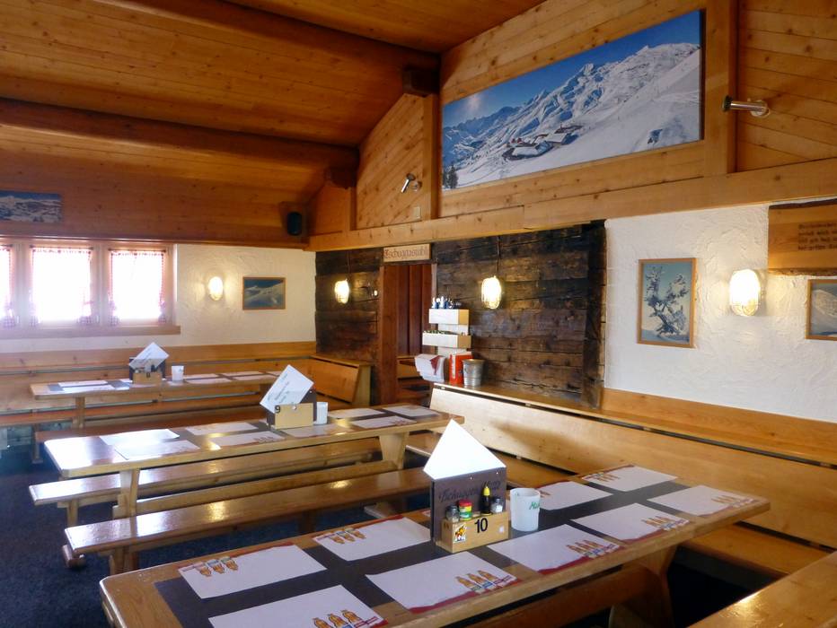 Die typische Schweizer Hütte bietet hausgemachte Speisen und einen traumhaften Blick mit großer Sonnenterrasse. An kalten Tagen wartet das urige Black Diamond Stübli.