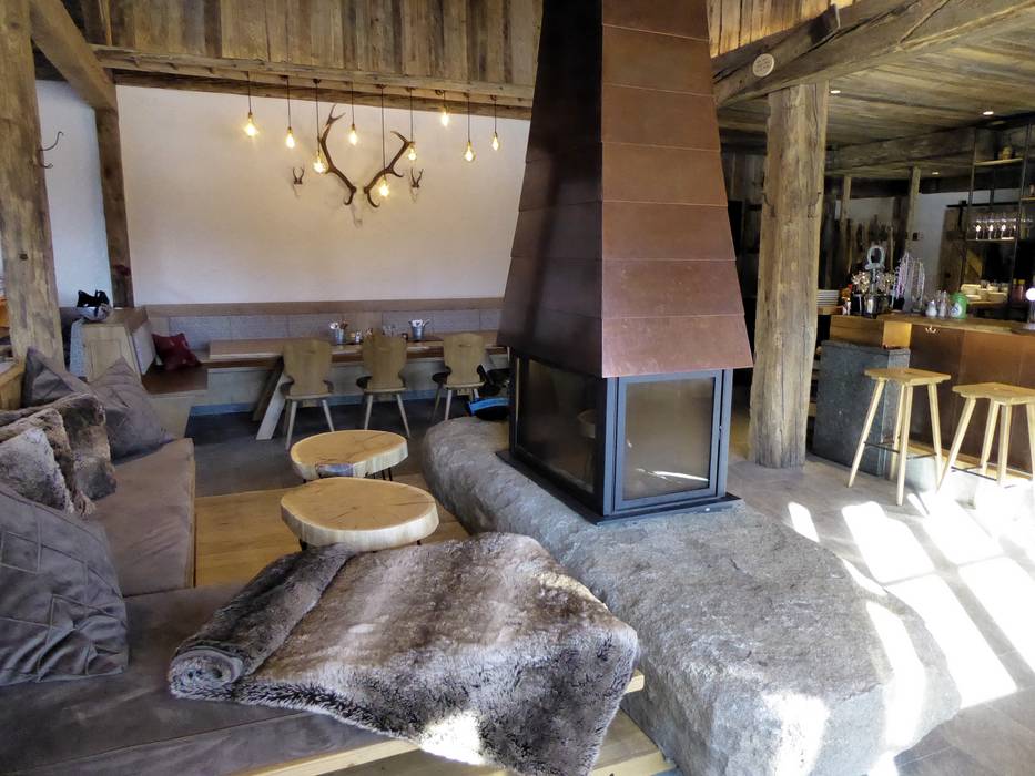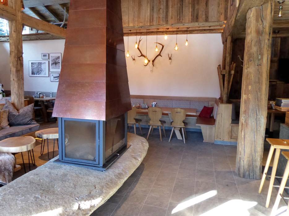 Die rustikale Hütte bietet leckeres Essen und gute Weine. Von der großen Sonnenterrasse hat man einen herrlichen Blick ins Angertal.
