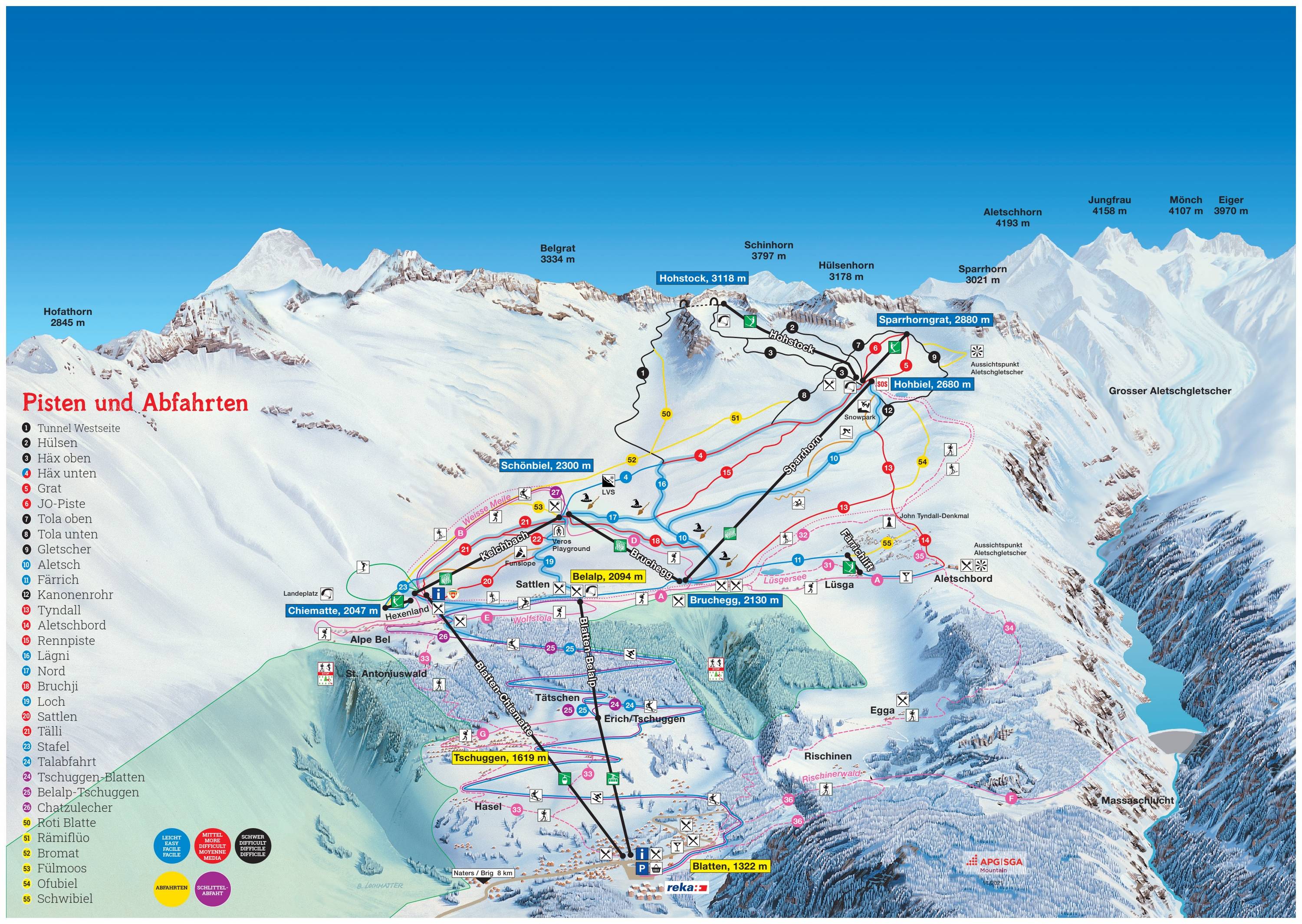 An der Talstation in Blatten und bei den Bergstationen der Luftseilbahn und der Gondelbahn gibt es Panoramatafelen mit aktuellen Betriebsinformationen. Die Pisten sind alle sehr gut ausgeschildert und markiert. Somit findet man sich im hochalpinen Gelände auch bei Nebel gut zurecht.