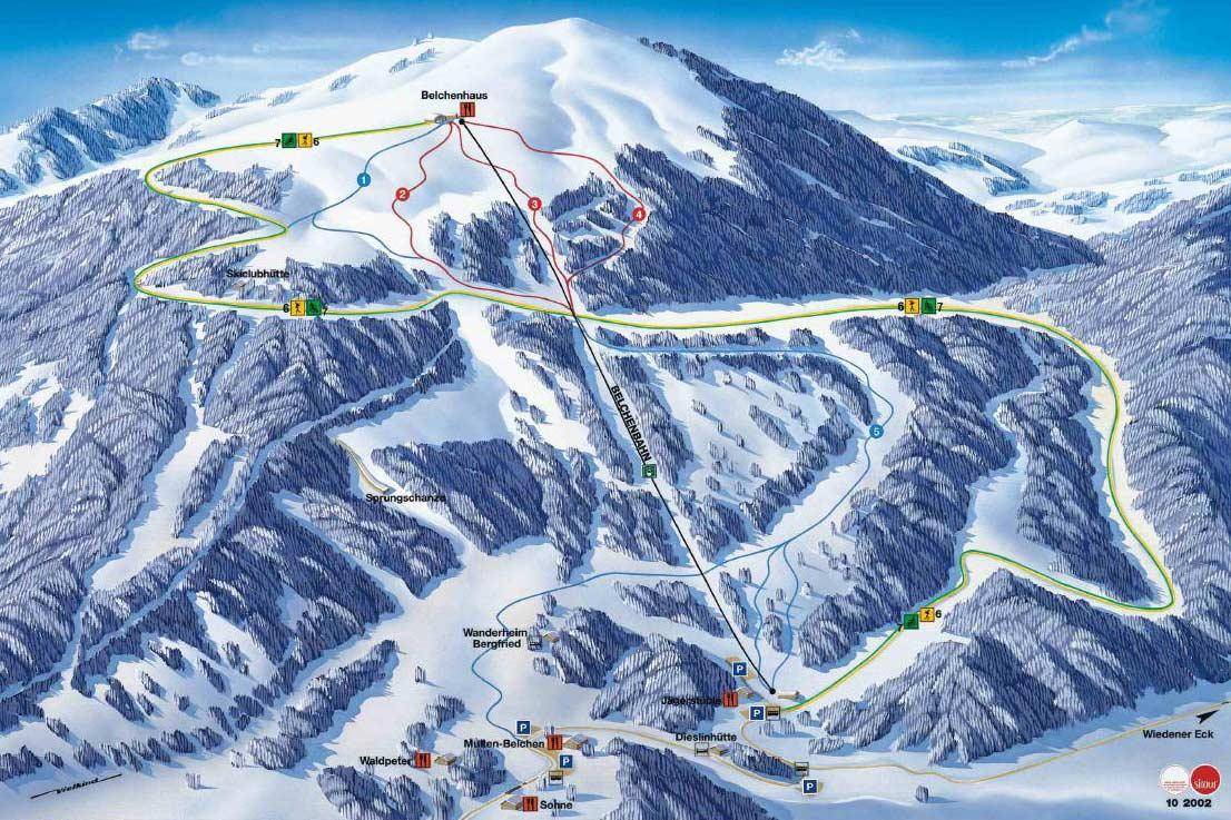 Das Skigebiet am Belchen ist klein und überschaubar. An der Talstation befindet sich eine Panoramatafel mit aktuellen Hinweisen zu geöffneten Pisten. Der Pistenplan ist übersichtlich gestaltet. Einige Informationen, wie beispielsweise Höhenangaben, könnten hinzugefügt werden.