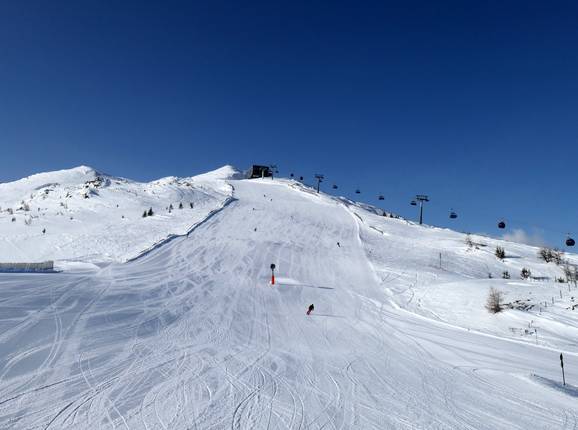 Zur Talstation der Gondelbahn führen mittelschwere Pisten und eine steile Skiroute.