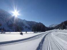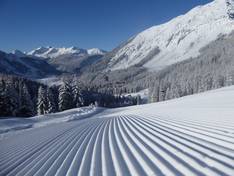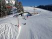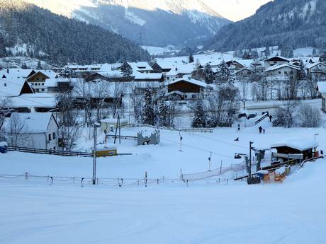 Das Areal der Skischule Bichlbach ist etwas kleiner als in Berwang, verfügt allerdings auch über ein Förderband und einen Seillift. Auf dem Übungshang am Sonnbichllift ist wenig Betrieb, so haben die Kleinsten hier viel Ruhe für ihre ersten Schwungversuche.