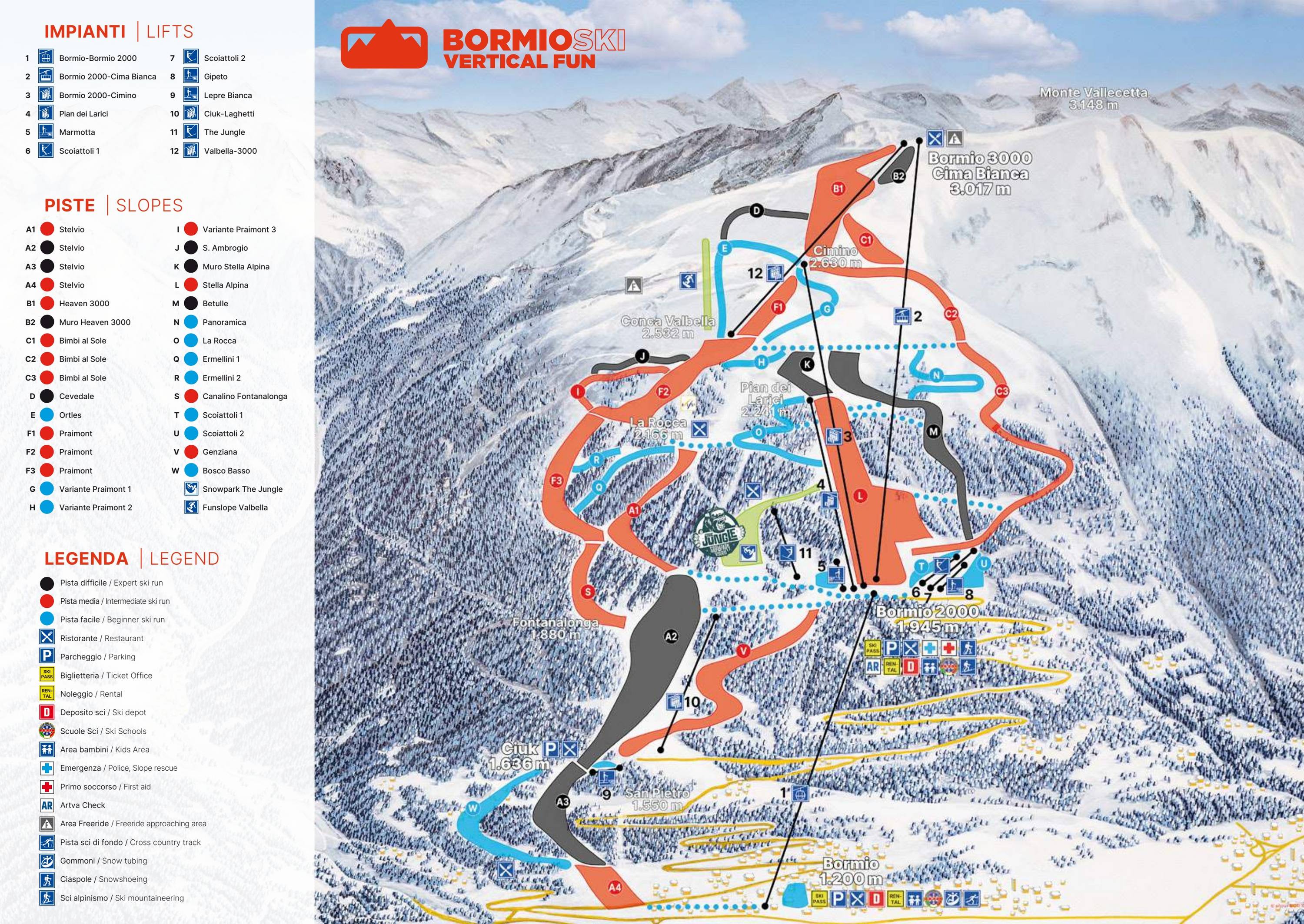 Orientierung (Pistenplan, Informationstafeln, Ausschilderung) und Sicherheit im Skigebiet Bormio – Cima Bianca