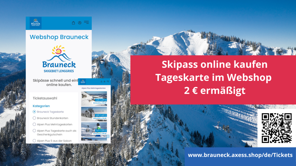 Im Webshop können Sie eine bereits vorhandene Alpen Plus Chipkarte aufladen oder einen Voucher erwerben, der an den Skigebiets-Kassen oder am Ticketautomaten im Skigebiet gegen einen Skipass eingelöst werden kann. Ticketautomaten befinden sich an den Talstationen der Brauneck-Bergbahn.brauneck.axess.shop/de/Tickets