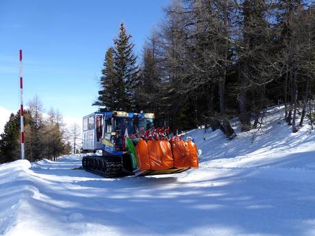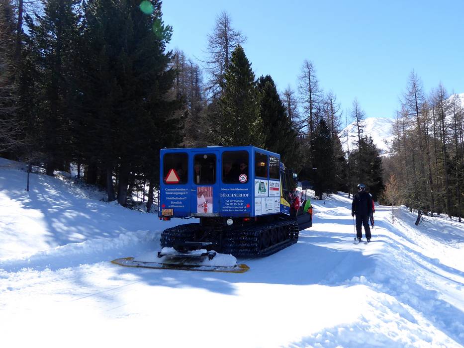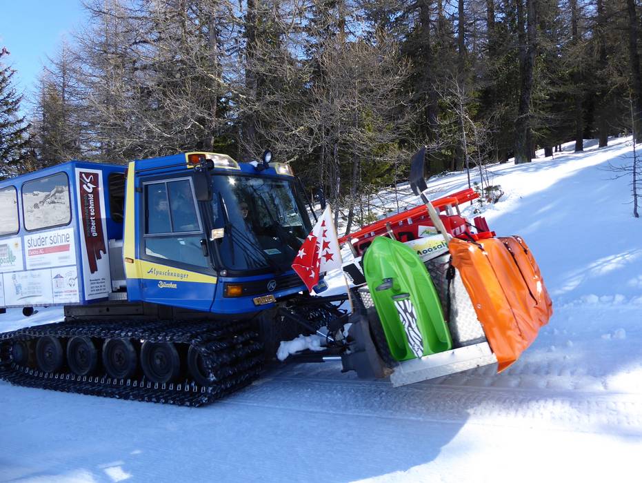 Der Alpuschnaager ist ein Pistenfahrzeug mit Personenkabine für bis zu 20 Personen. Von ihm kann sich die ganze Familie von Bürchen auf die Bürchner- oder Moosalp bringen lassen. Hier warten gleich drei tolle Bergrestaurants. Und das Beste: Der Fahrer hat auch Schlitten dabei, für die mehr als fünf Kilometer lange Abfahrt zurück.