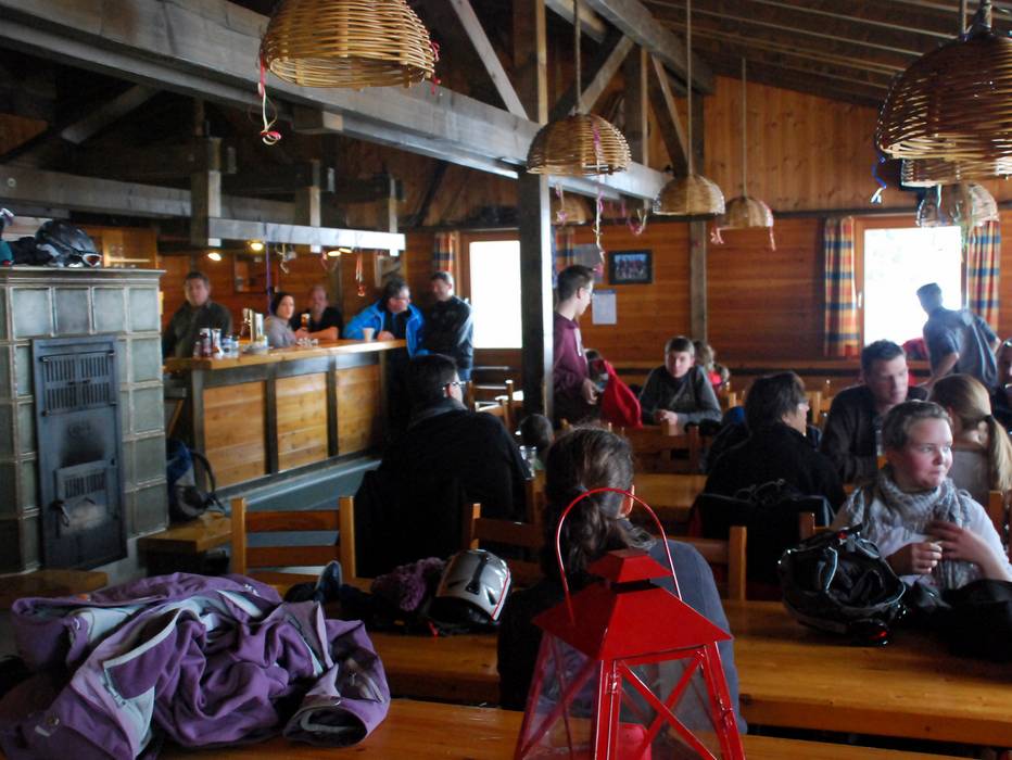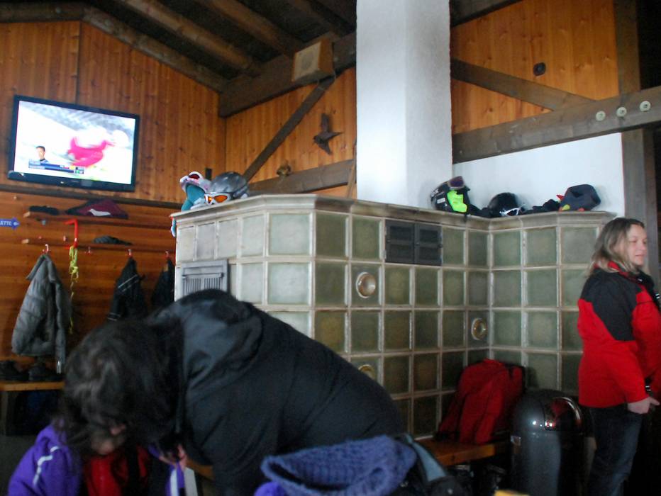 Die Skihütte ist geräumig, der große Kachelofen sorgt für Gemütlichkeit und auf dem Großbildschirm läuft Ski-Weltcup. Das Speisenangebot ist zwar arg eingeschränkt, aber die Preise sind familienfreundlich und die leckeren Bratwürste vom Grill vor der Hütte reichen für den kleinen Hunger.