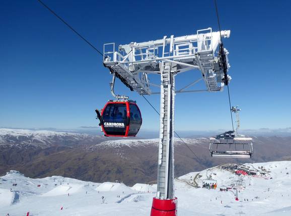 Weites Skigelände am Captain's Express Kombibahn mit Base Area Cardrona Blick von der Base Area zum Whitestar Express Skigebiet Cardrona mit Snowpark