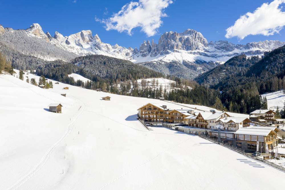 Das 5-Sterne-Hotel Cyprianerhof Dolomit Resort liegt inmitten des UNESCO-Weltnaturerbes der Dolomiten, mit Blick auf das beeindruckende Felsmassiv des Rosengartens.