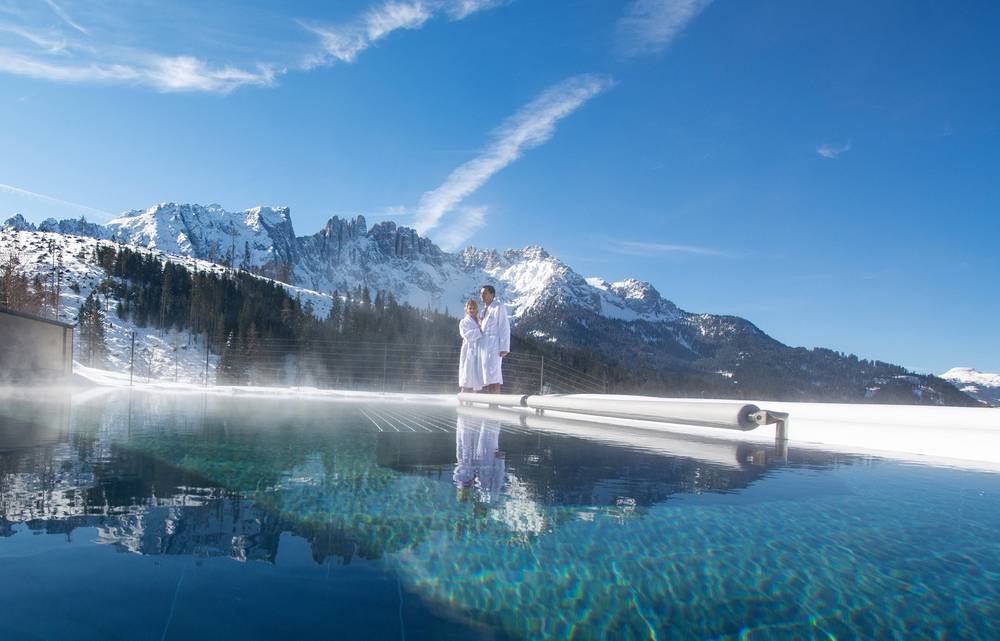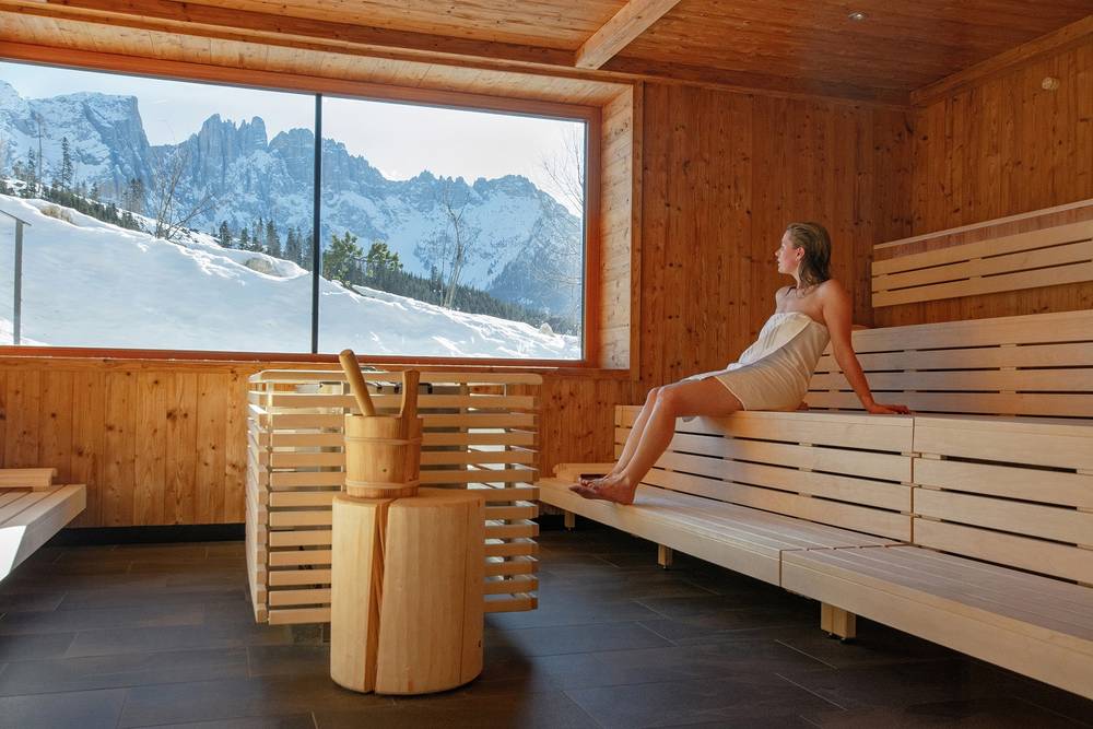 Im neuen Alm Spa (18+) erwarten Sie der Enrosadira Skypool, vier Panoramasaunen, tägliche Aufgüsse und Sundowner-Ruheräume mit Blick auf die Dolomiten.