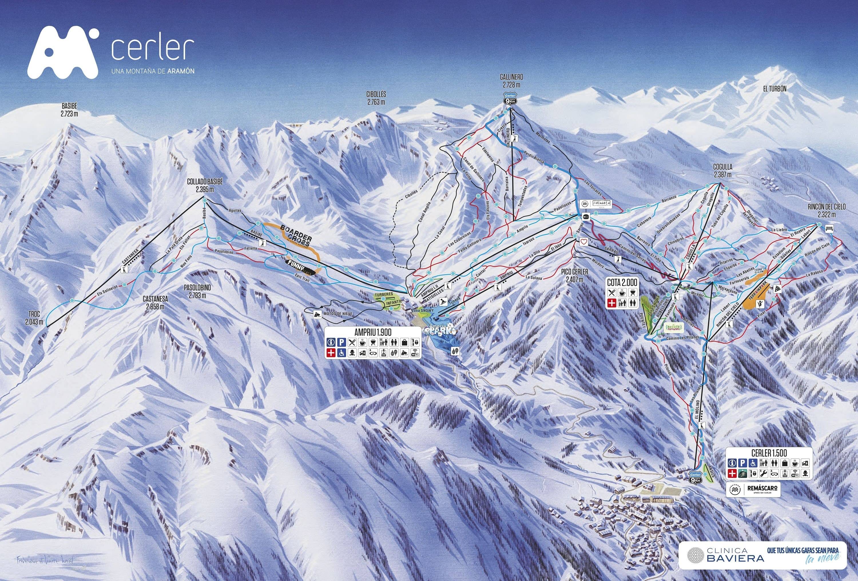 Der Pistenplan stellt das Skigebiet Cerler übersichtlich und mit vielen Informationen sehr gut dar. Es sind alle Pisten und Lifte mit angegeben. Die Lifte könnten allerdings noch mehr im Detail aufgeführt werden.