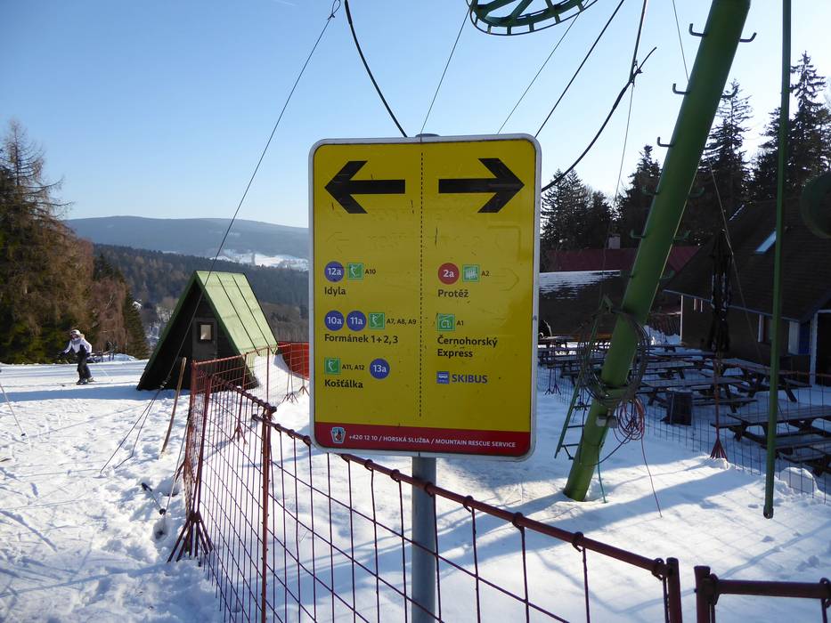 Orientierung (Pistenplan, Informationstafeln, Ausschilderung) und Sicherheit im Skigebiet Černá hora – Janské Lázně