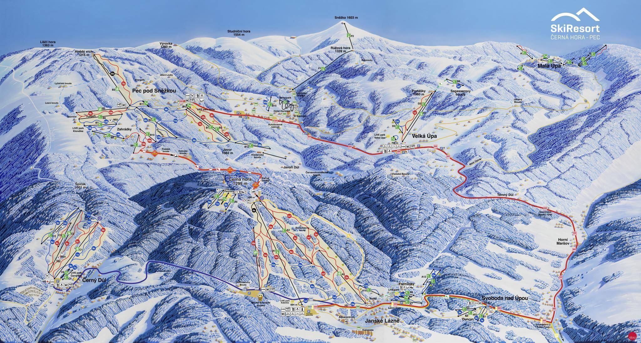 Pistenplan Černá hora/Pec pod Sněžkou/Černý Důl/Velká Úpa/Svoboda nad Úpou/Malá Úpa Saison 2025/2026