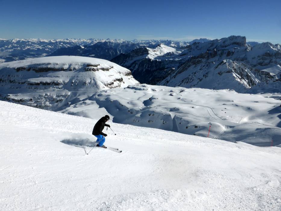 Spektakuläre Piste vom Chäserrugg durch ein weitgehend unberührtes Tal.