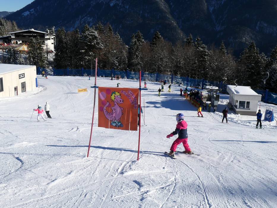 Beim Tellerlift DinoJet lernen die Kinder das Ski- und Liftfahren spielend. Kleine Snowpark-Hindernisse stehen bereit.