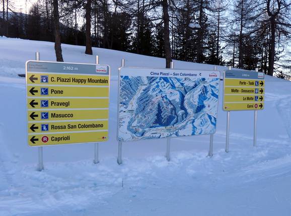 Orientierung (Pistenplan, Informationstafeln, Ausschilderung) und Sicherheit im Skigebiet Cima Piazzi/San Colombano – Isolaccia/Oga
