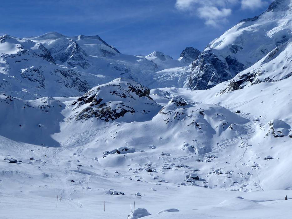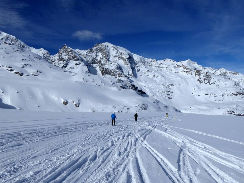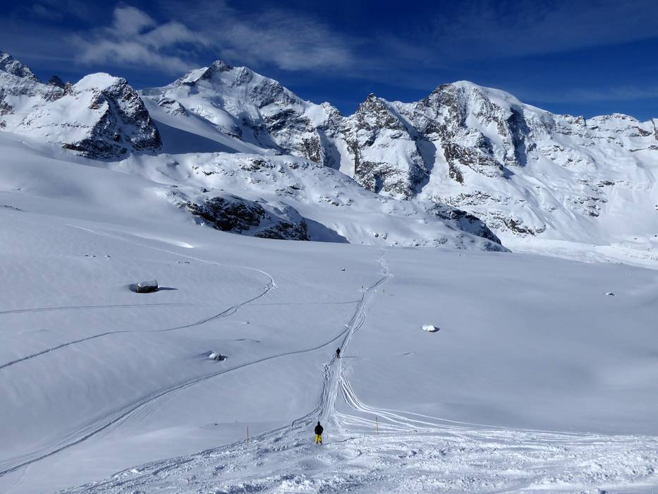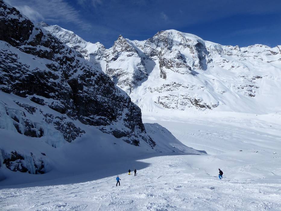 Das Highlight ist die 10 km lange Gletscherabfahrt auf der Naturpiste über den Morteratschgletscher. Von hier geht es mit der Bahn wieder hinauf zum Berninapass.