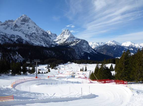 Das Skigebiet Ehrwalder Alm – Ehrwald befindet sich in der Tiroler Zugspitz Arena (Österreich, Tirol, Außerfern).