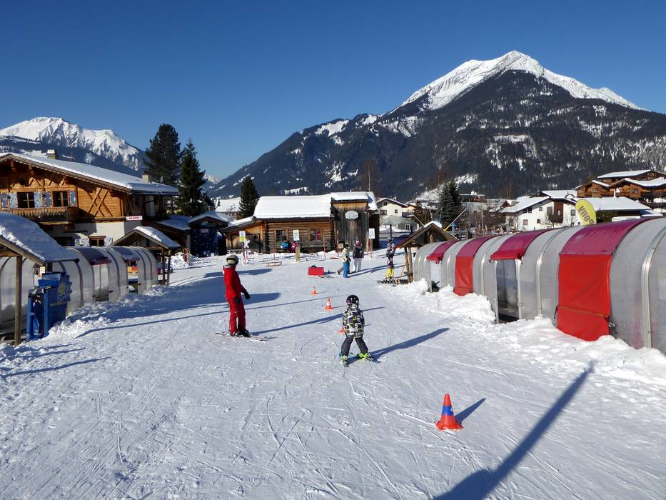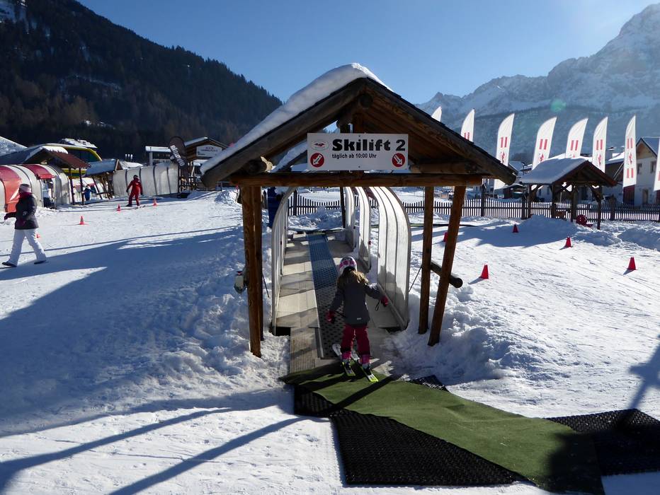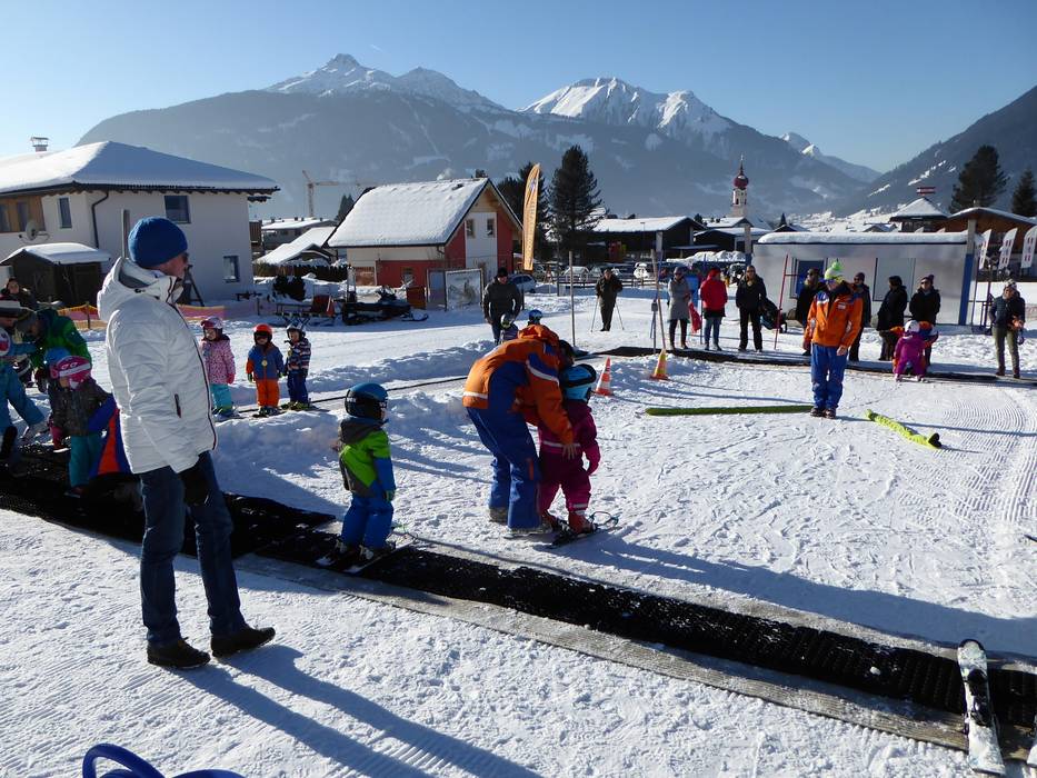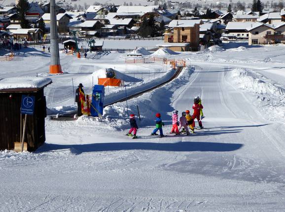 Das Kinderland der Skischule Total befindet sich an der Talstation des Sonnenhang Sunracers. Kindern lernen am Zauberteppich (Förderband).