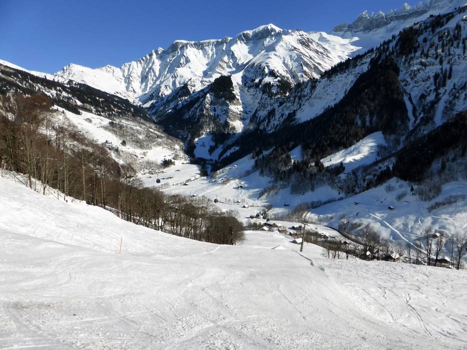 Vom höchsten Punkt im Skigebiet an der Doppelsesselbahn Pleus bin ins Tal nach Elm