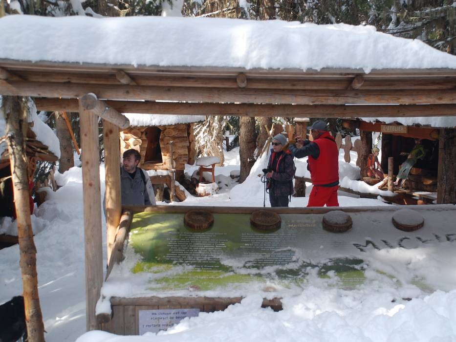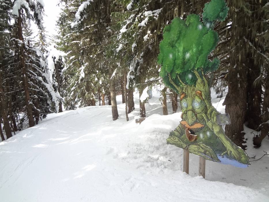 Schön gestalteter Rätselparcours durch den Wald oberhalb von Les Saisies, den Kinder mit Ski oder Schneeschuhen erkunden können.