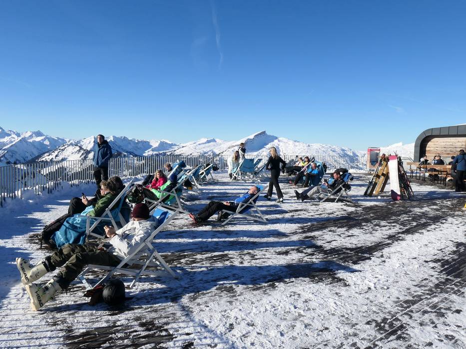 An beiden Talstationen kann man den Tag in Après-Ski-Schirmbars schön ausklingen lassen. Oben im Skigebiet stehen Skihütten und Bars mit Liegestühlen bereit.