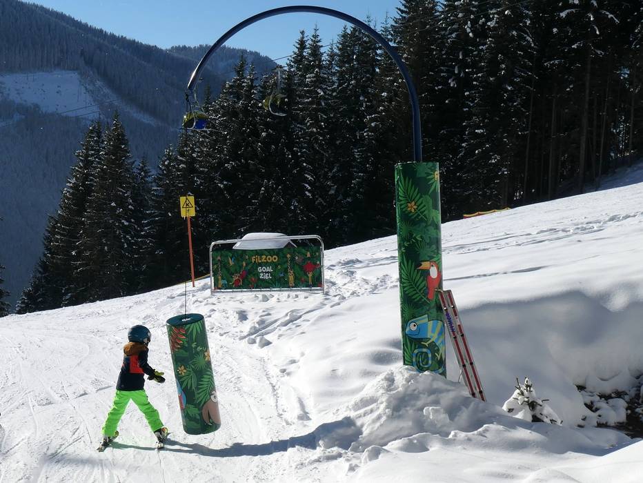 Die Erlebnisabfahrt FilZOO ist eine abenteuerliche Strecke bei der 6er-Sesselbahn sixpack Mooslehen. Lustige Zoo-Figuren, kleine Hindernisse und eine Wellenbahn begeistern Groß und Klein.