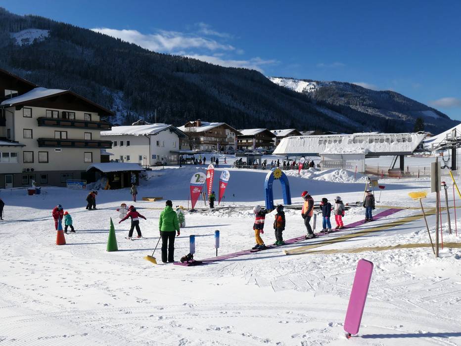 Das sehr große Skischulareal liegt direkt in Filzmoos rund um den Bögrainlift. Zauberteppiche, Übungslifte, ein Besuch von Tieren am Bauernhof, Abfahrten im Zauberwald, Wellenbahnen, Spaß mit dem Maskottchen sind nur einige Highlights.