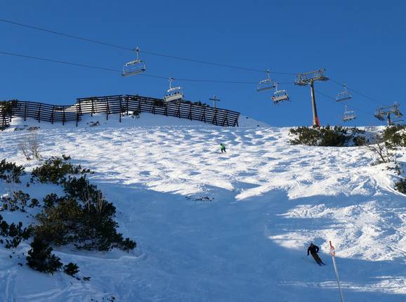 Nur eine kurze Variante der Talbfahrt ist im Skigebiet Füssener Jöchle als schwere Piste ausgezeichnet. Die Talabfahrt selbst ist jedoch schön lang. Dazu ist zwischen den Pisten immer wieder ein Abstecher in den Tiefschnee möglich.