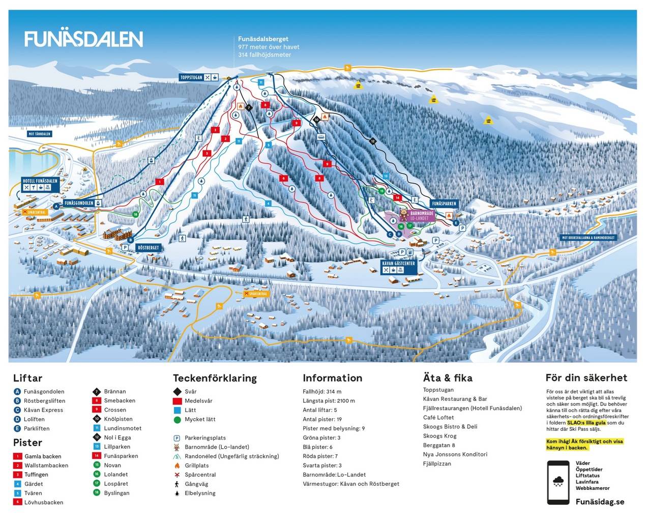 Der Pistenplan des Skigebiets Funäsdalsberget bietet eine übersichtliche und zugleich detailreiche Darstellung des gesamten Areals. Sämtliche Liftanlagen, Abfahrten und wichtigen Orientierungspunkte sind klar eingezeichnet, sodass man sich schnell und problemlos zurechtfindet. Auf der Rückseite des Plans finden sich zudem ergänzende Informationen, etwa zu Serviceeinrichtungen, Infrastruktur und den Einkehrmöglichkeiten.