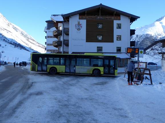 Der nächste Bahnhof ist Landeck. Direkt am Bahnhofsvorplatz startet der Linienbus in Richtung Paznaun. Die Busfahrt bis nach Galtür dauert etwas über 1 Stunde. - Skibusse