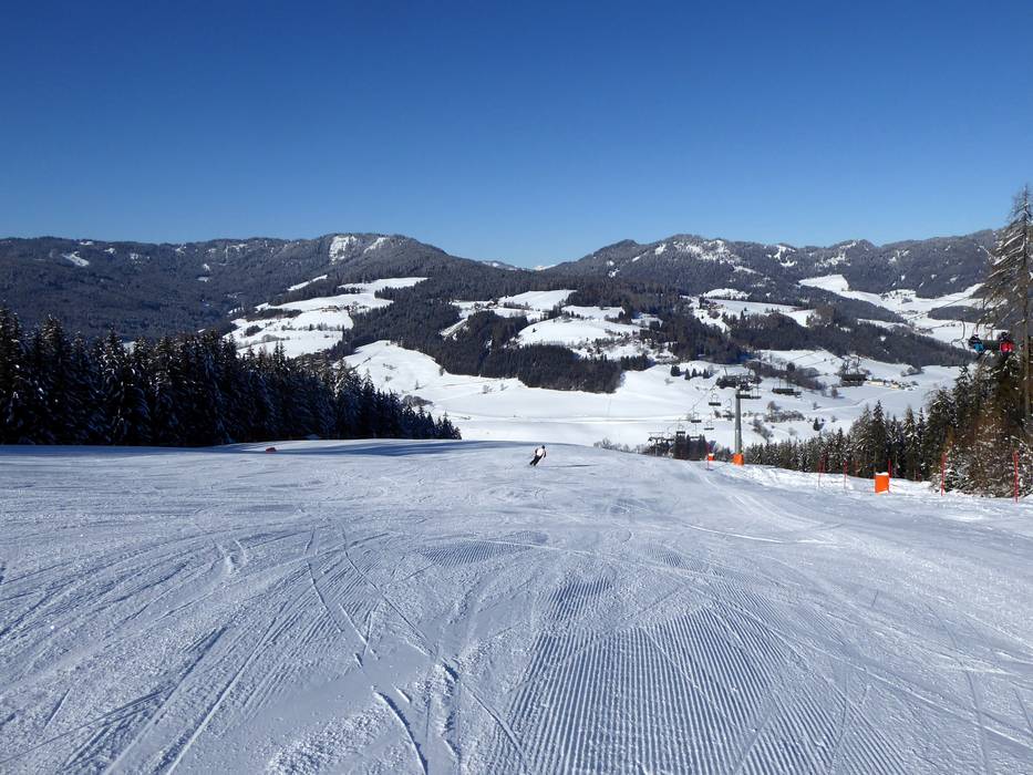 Eine sehr breite Piste führt entlang der Sesselbahn zu Tale. Sie ist perfekt zum Carven geeignet.