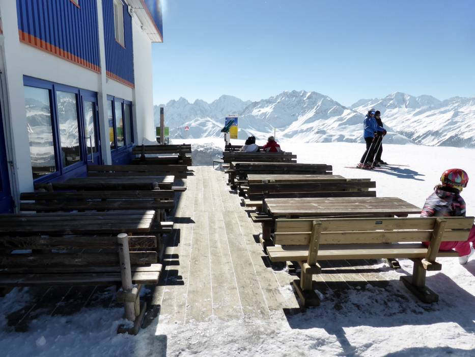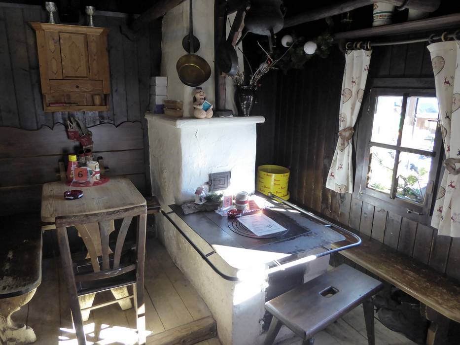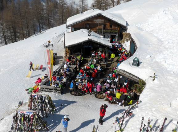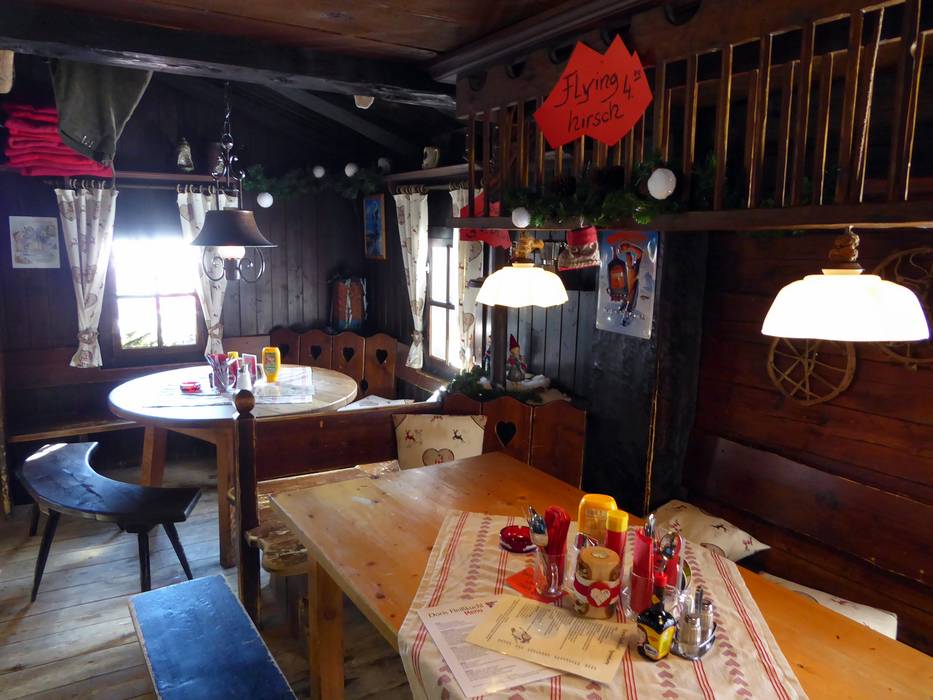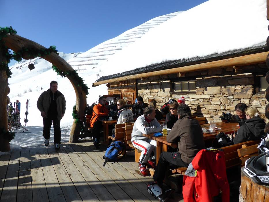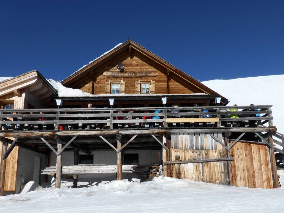 Die Skihütte hat eine sehr schöne Sonnenterrasse und am Nachmittag sehr lange Sonne. Innen hat die Hütte altes Holz.