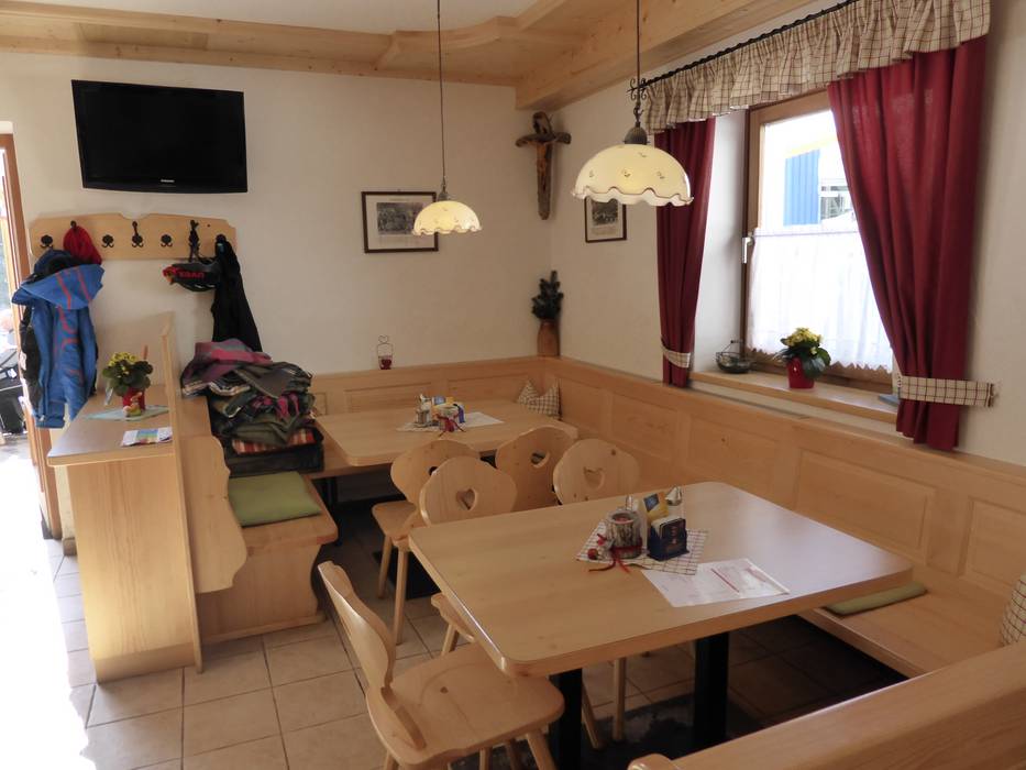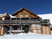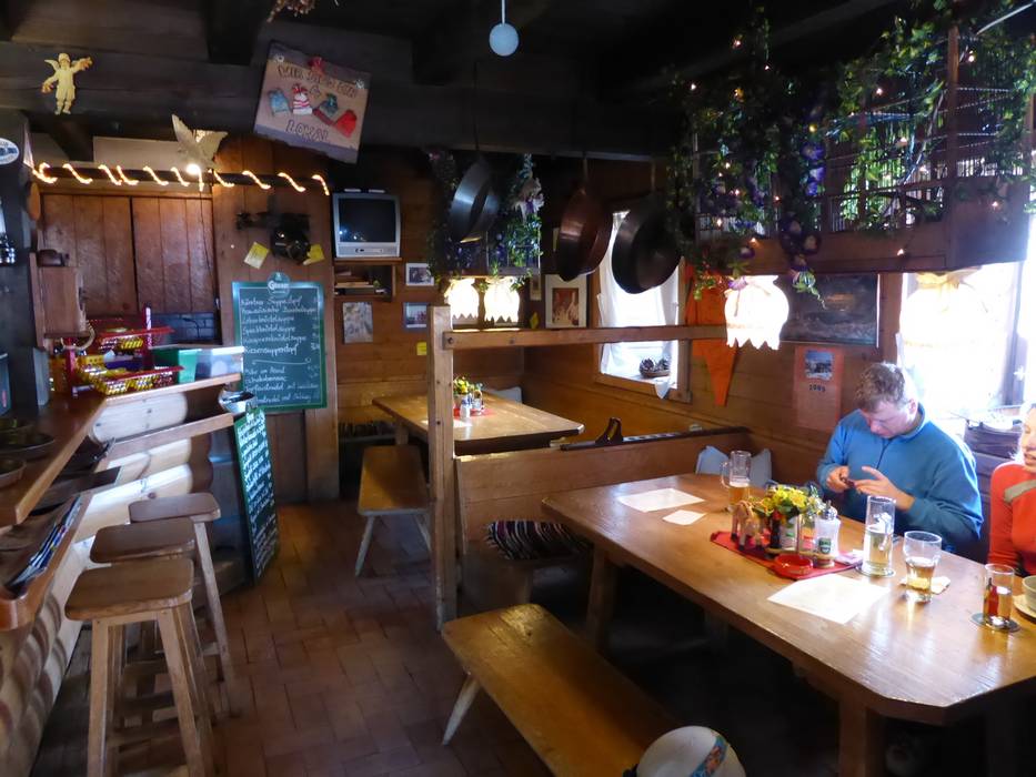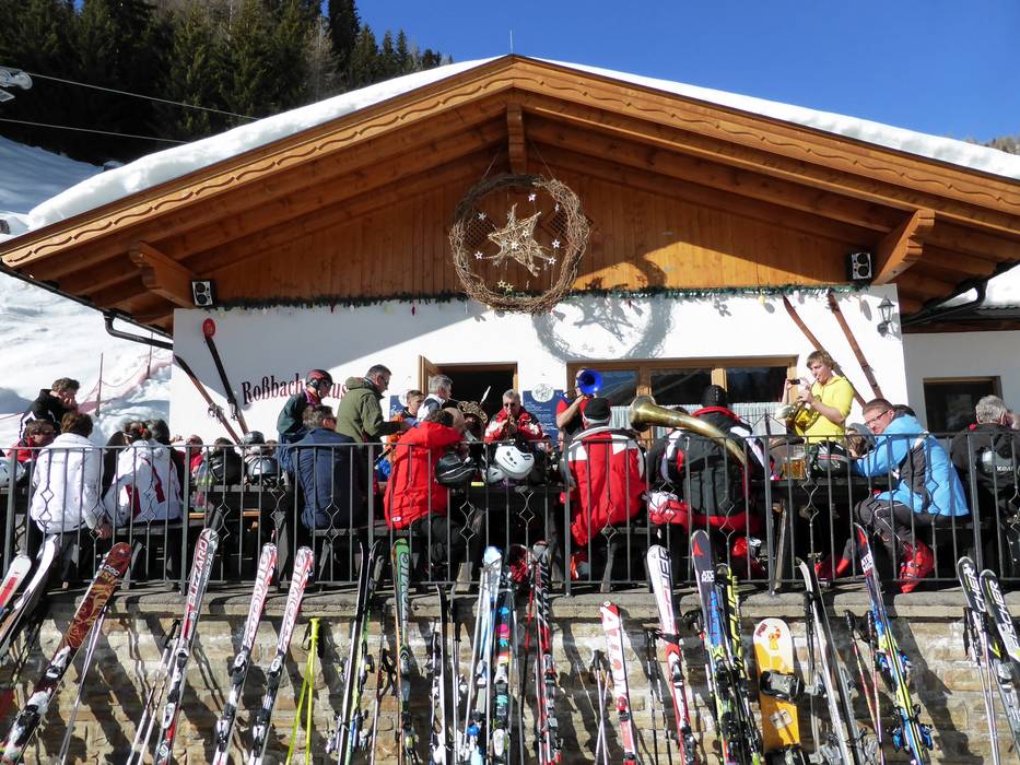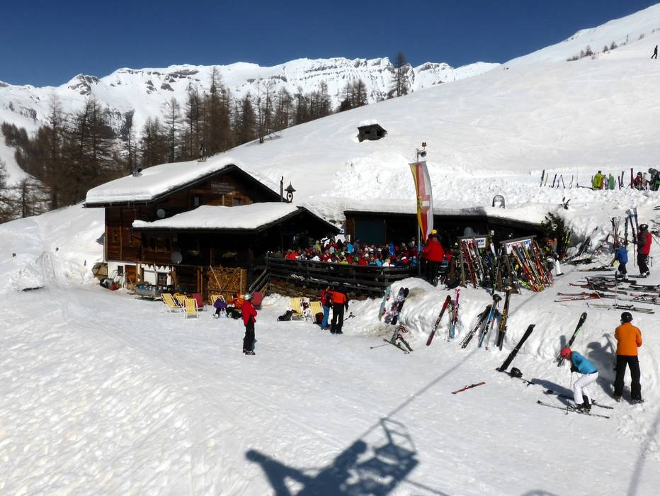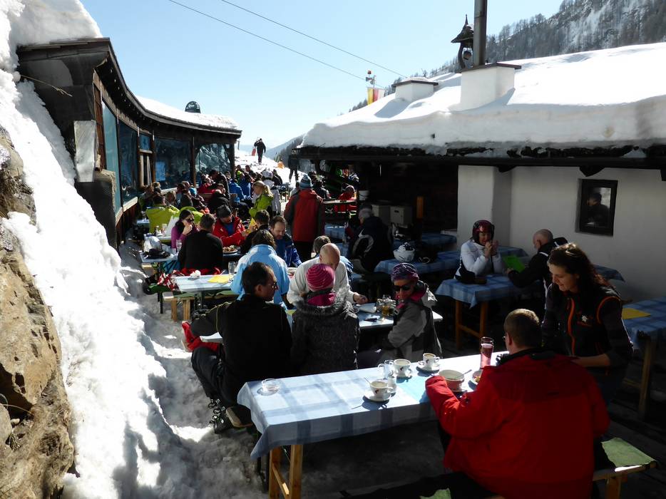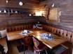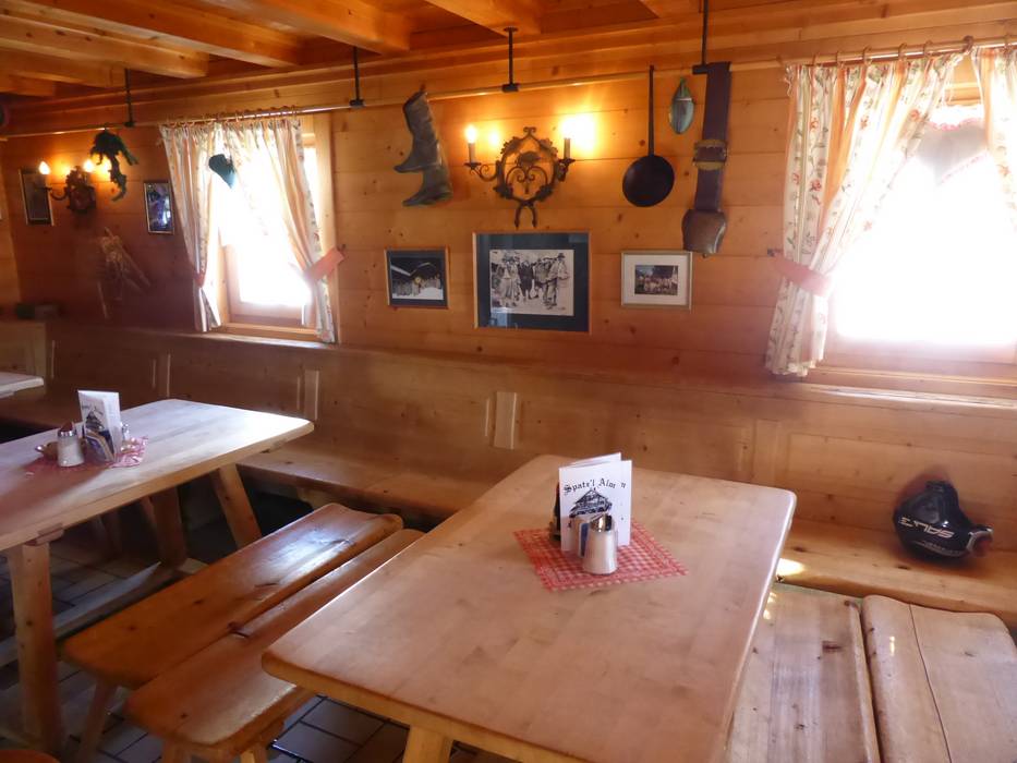 Die Skihütte hat eine sehr schöne Sonnenterrasse und am Nachmittag sehr lange Sonne. Innen hat die Hütte altes Holz.