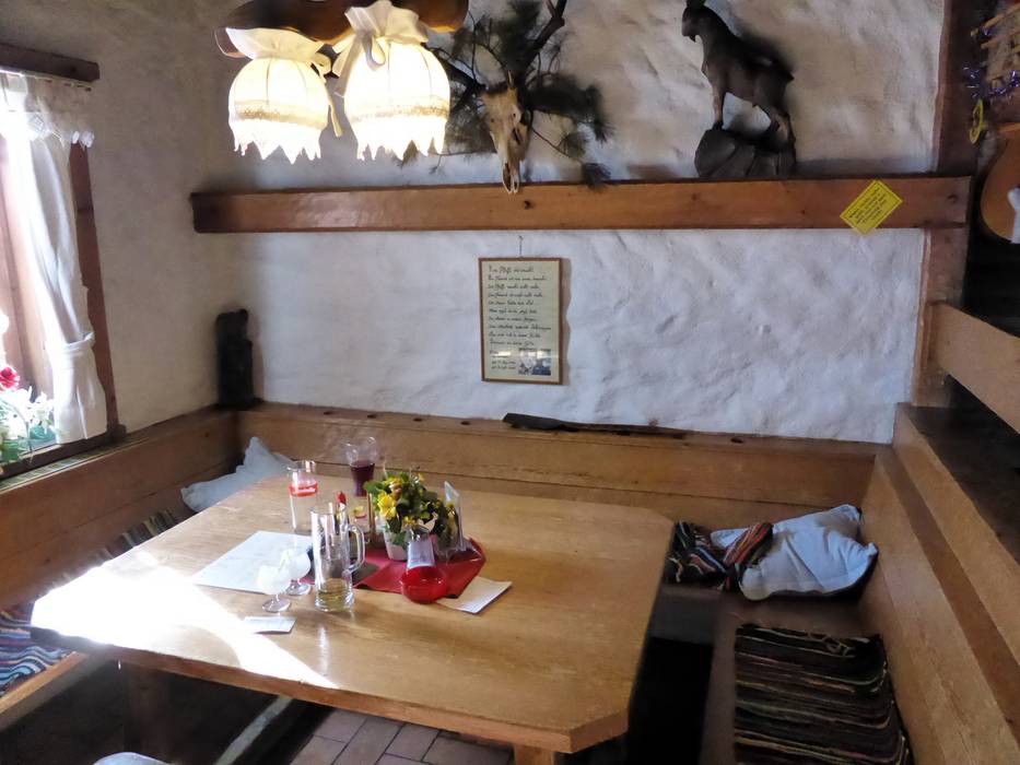 Gemütliche Hütte mit Sonnenterrasse und Liegestühlen. Es werden typische Kärntner Gerichte serviert.