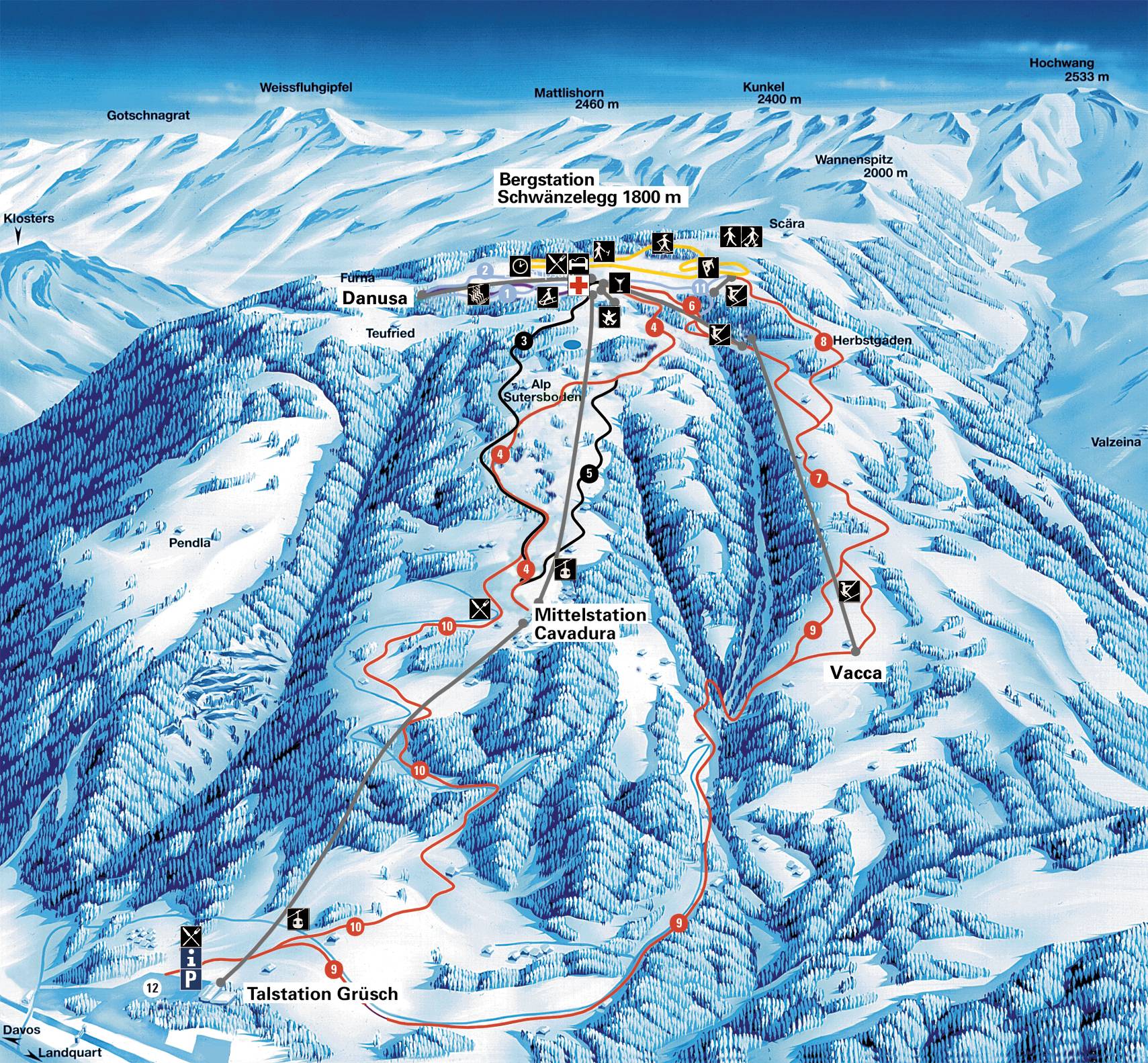 Der Pistenplan bildet das gesamte Skigebiet Grüsch Danusa sehr gut ab. Man findet alle wichtigen Informationen. Es könnten allerdings noch weiterführende Daten zu den Skiliften angegeben sein.