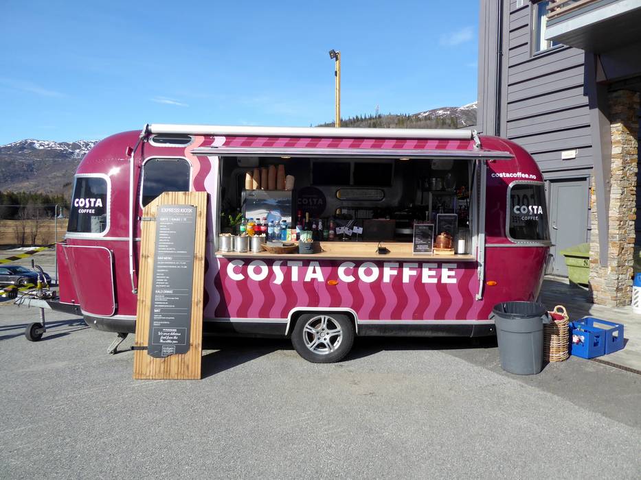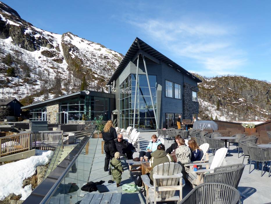 Das Café ist in einem traditionellen norwegischen Stil gehalten – warm und einladend mit rustikalen Holzmöbeln. Bei schönem Wetter kann man auf der Sonnenterrasse den tollen Bergblick genießen.