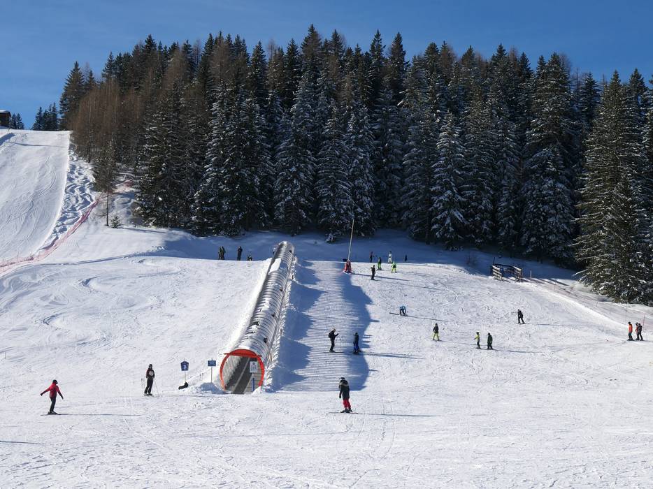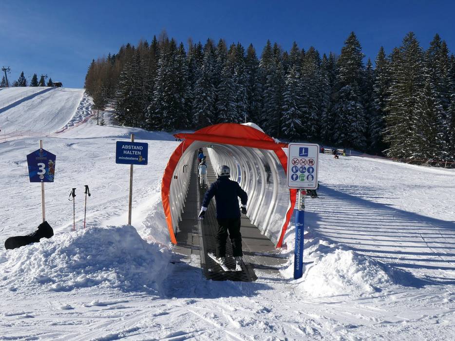 Der SnowTrail befindet sich rechts bei der Hirschkogelpiste im Bereich der Abzweigung zum Sonnkogel. Mit Wellenbahn, Steilkurven und Obstacles haben große und kleine Gäste richtig Spaß beim Skifahren und Snowboarden.