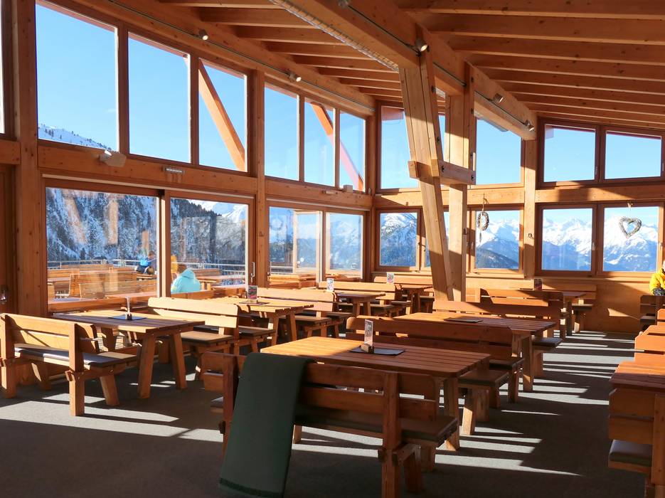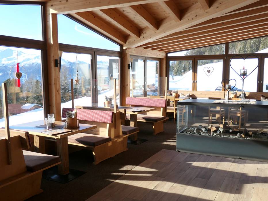 Die Kombination aus Glas, Holz und warmen Farbtönen ist etwas ganz Besonderes. In der Panorama Lounge wird man mit verschiedenen Bierspezialitäten, Raritäten rund um die seltene Zirbe und zünftiger Brotzeit verwöhnt – Rundumblick inklusive. Hier finden auch Fondueabende statt, die gebucht werden können.