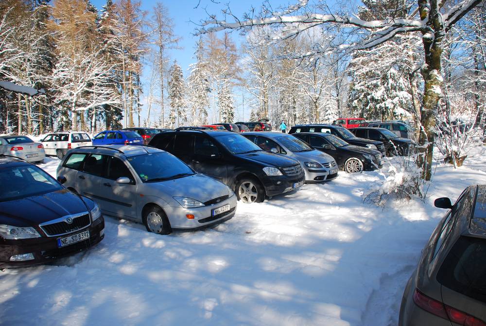 Von der Autobahn A45 (Sauerlandlinie) sind es nur 23 km bis zum Parkplatz auf dem Gipfel der Hohen Bracht. Die Anfahrt über die Bergstraße Hohe Bracht bietet tolle Blicke über das Sauerland. Den Parkplatz nutzen auch Langläufer, Winterwanderer und Gastronomiebesucher – da wird es schnell mal voll.