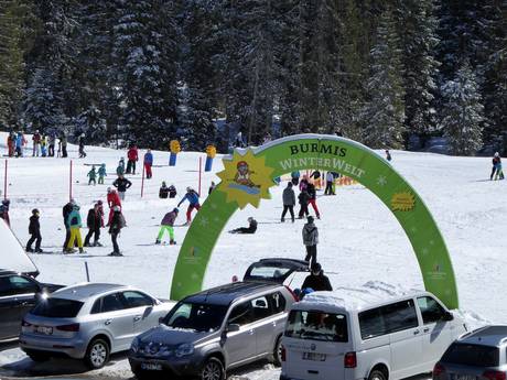 In Burmis WinterWelt direkt an der Talstation fühlen sich Kinder und Anfänger sehr wohl. Förderbänder, ein Tellerlift und flache Übungspisten sind ideal für den Einstieg. Für den Anfängerbereich gibt es einen eigenen reduzierten Skipass. Die AlpinLodge Auenhütte sorgt für das leibliche Wohl. Die Skischule Hirschegg führt Skikurse durch.