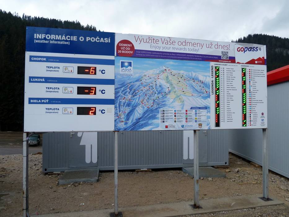 Sämtliche Pisten sind sehr gut ausgeschildert. Die Ausschilderung ist in mehreren Sprachen, immer auf Slowakisch und Englisch. Teilweise findet man auch Ausschilderungen in deutscher Sprache. An den Abzweigungen findet man immer Schilder und zumeist auch mit Pistenplänen. An den Einstiegen zu den Liftanlagen werden Informationen per Flatscreen mit aktuellen Infos und Webcambildern aus dem Skigebiet gezeigt.