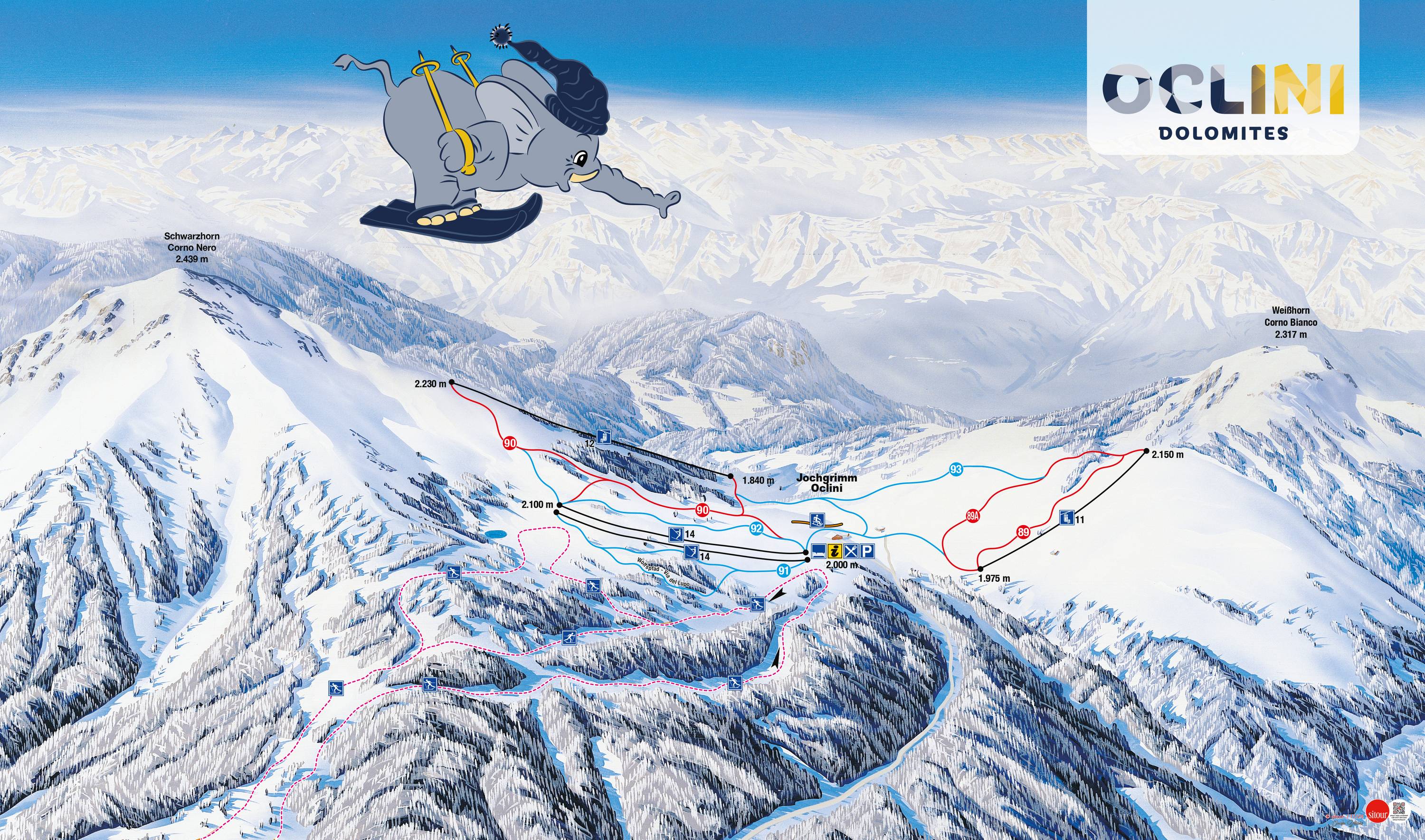 Der Pistenplan vom Jochgrimm bildet das kleine Skigebiet gut ab. Man findet alle Pisten und Lifte. Zusätzlich findet man das Skigebiet auch im Pistenplan von Dolomiti Superski im Val di Fiemme/Obereggen.